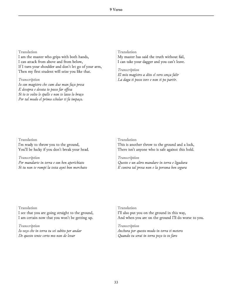 The Flos Duellatorum is the most cryptic of Fiore's Italian surviving manuscripts. Written mostly in terse ryhming couplets, it is less detailed than his longer Fiore di Battaglia manuscript ("The Getty"), but it contains several unique techniques and offers a different perspective to his fighting arts.
