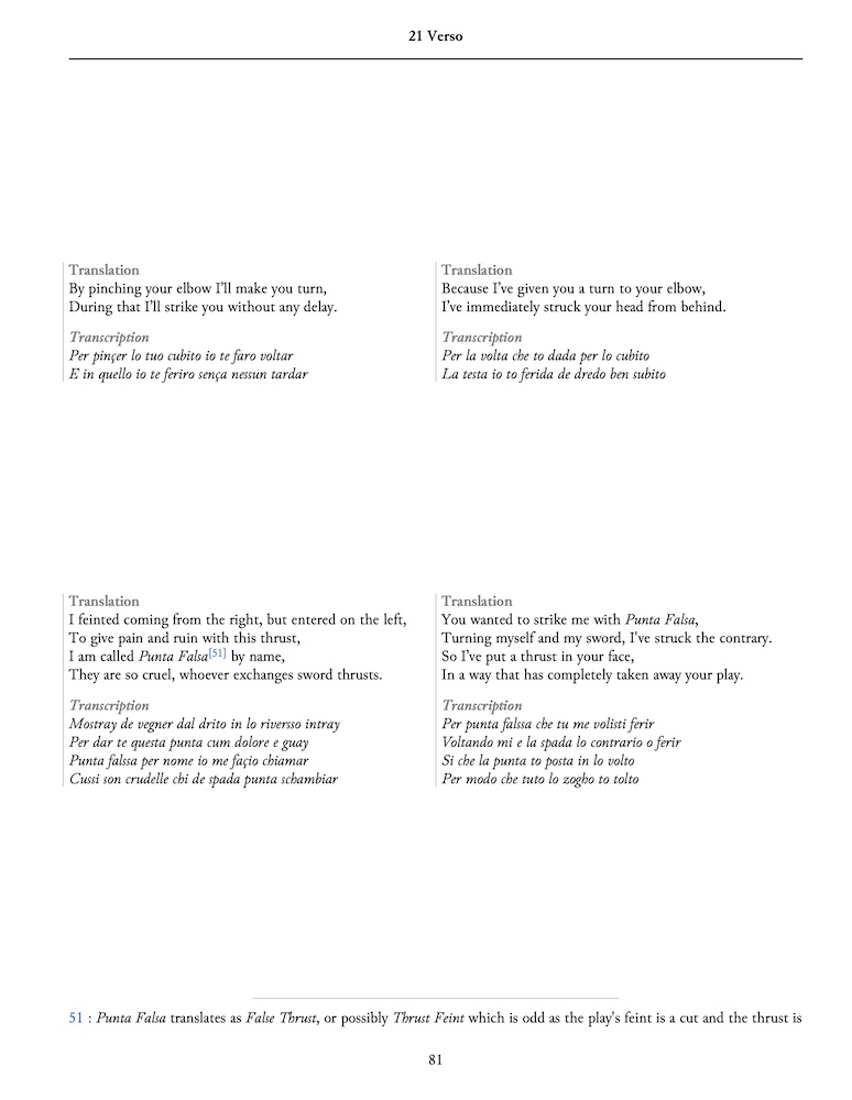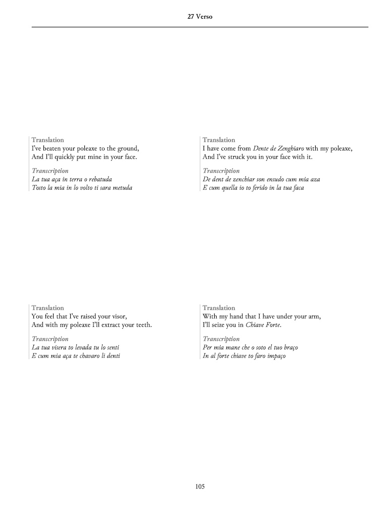 A straight forward translation of Fiore dei Liberi's 1409 Flos Duellatorum, a treatise on the mediaeval art of arms. It reproduces the original manuscript, along with a transcription and translation of the text into modern English.